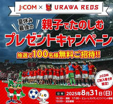浦和レッズ J:COM x URAWA REDS 親子でたのしむプレゼントキャンペーン。2025年8月31日(日)、埼玉スタジアム2〇〇2で開催される、Jリーグの試合「浦和レッズ vs アルビレックス新潟」及び、岡野選手&興梠選手のトークショー、サイン入りグッズ抽選会に、100名様を無料でご招待。