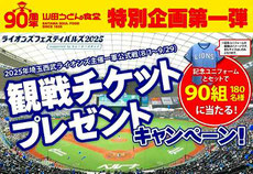 山田うどん 90周年特別企画 第1弾 2025年埼玉西武ライオンズ 観戦チケットプレゼントキャンペーン。2025年8月1日~9月29日に、ベルーナドームで開催される、埼玉西武ライオンズ主催の一軍公式戦 (全22試合のうちいずれか1試合)の観戦チケットを90組180名様にプレゼント。記念ユニフォームが当たるキャンペーンも実施。